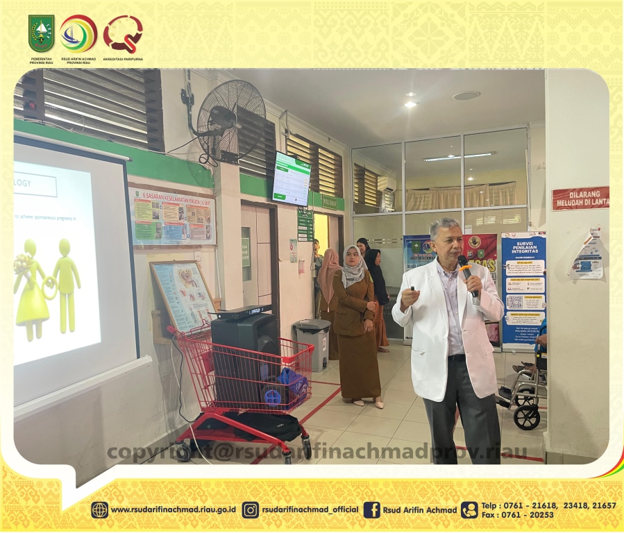 Instalasi PKRS RSUD Arifin Achmad Provinsi Riau mengadakan penyuluhan “Infertilitas Idiopatik pada Pria” kepada pengunjung di ruang tunggu poliklinik rawat jalan dengan menghadirkan narasumber dokter spesialis Urologi RSUD Arifin Achmad Provinsi Riau Dr. dr. Afdal, Sp.U, Subsp. And (K).
