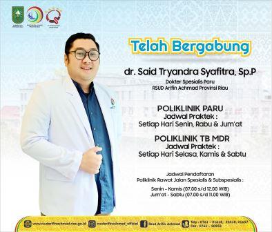 dr. Said Tryandra Syafitra, Sp.P merupakan dokter spesialis paru dan bertugas di poliklinik paru dan poliklinik TB MDR RSUD Arifin Achmad Provinsi Riau.