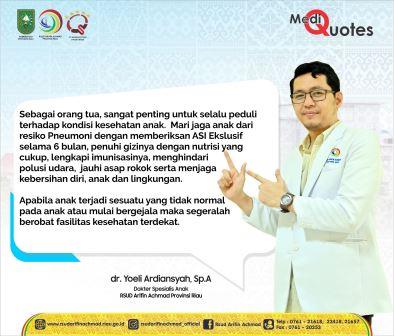 Instalasi PRKS RSUD Arifin Achmad Provinsi Riau mengadakan penyuluhan tentang “Deteksi Dini Pneumonia pada anak” menghadirkan narasumber dr. Yoely Ardiansyah, Sp.A di ruang tunggu ICU RSUD Arifin Achmad Provinsi Riau.